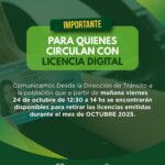 La Dirección de Tránsito informa que a partir de mañana, viernes 24 de octubre, de 12:30 a 14:00 hs., los conductores que circulan con licencia digital podrán retirar las licencias emitidas durante el mes de octubre 2025.