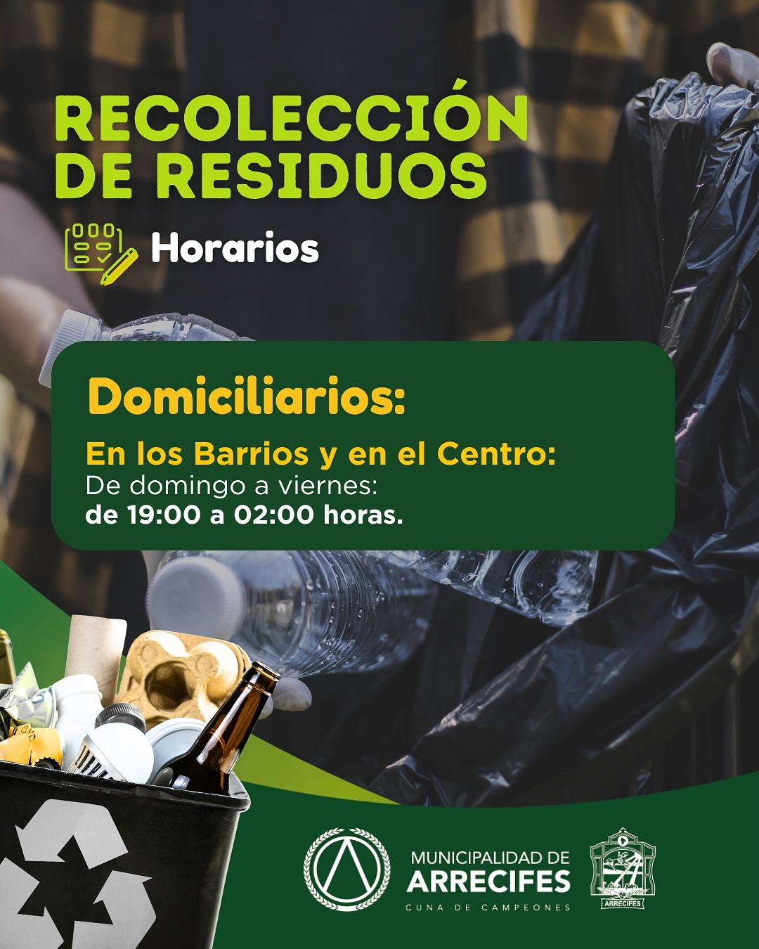 La Municipalidad informa los días y horarios de recolección de residuos domiciliarios y no domiciliarios según el siguiente cronograma: