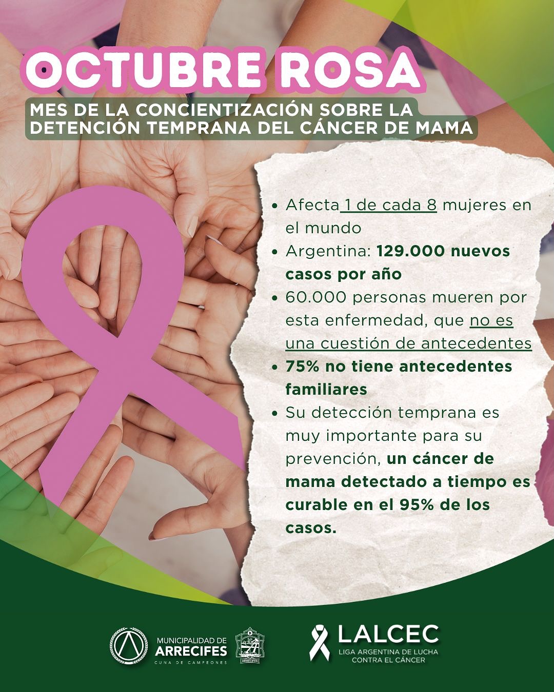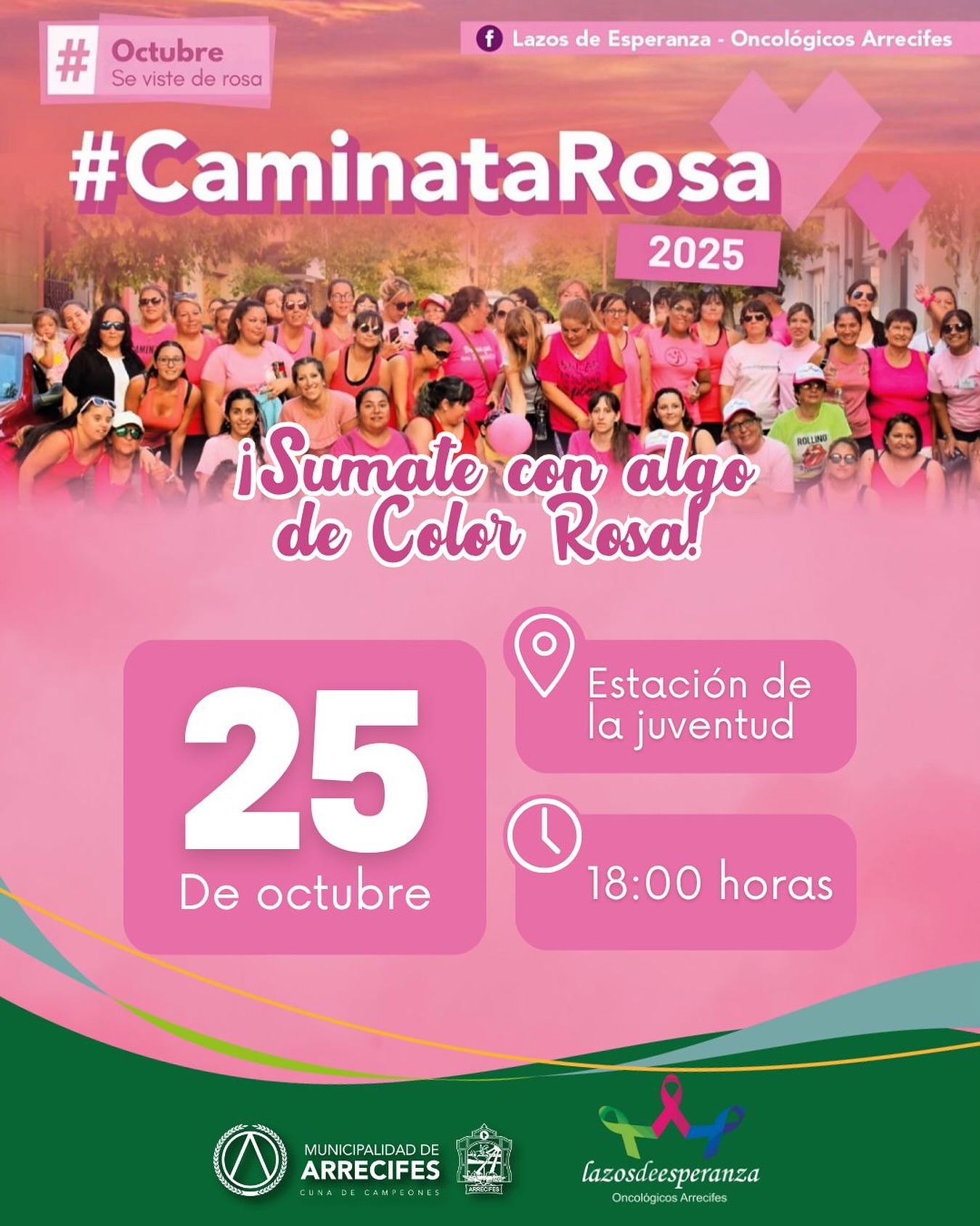 En el marco del mes de la concientización sobre el cáncer de mama, el grupo Lazos de Esperanza – Oncológicos Arrecifes invita a toda la comunidad a participar de una nueva edición de la Caminata Rosa, este sábado 25 de octubre a las 18:00 hs.