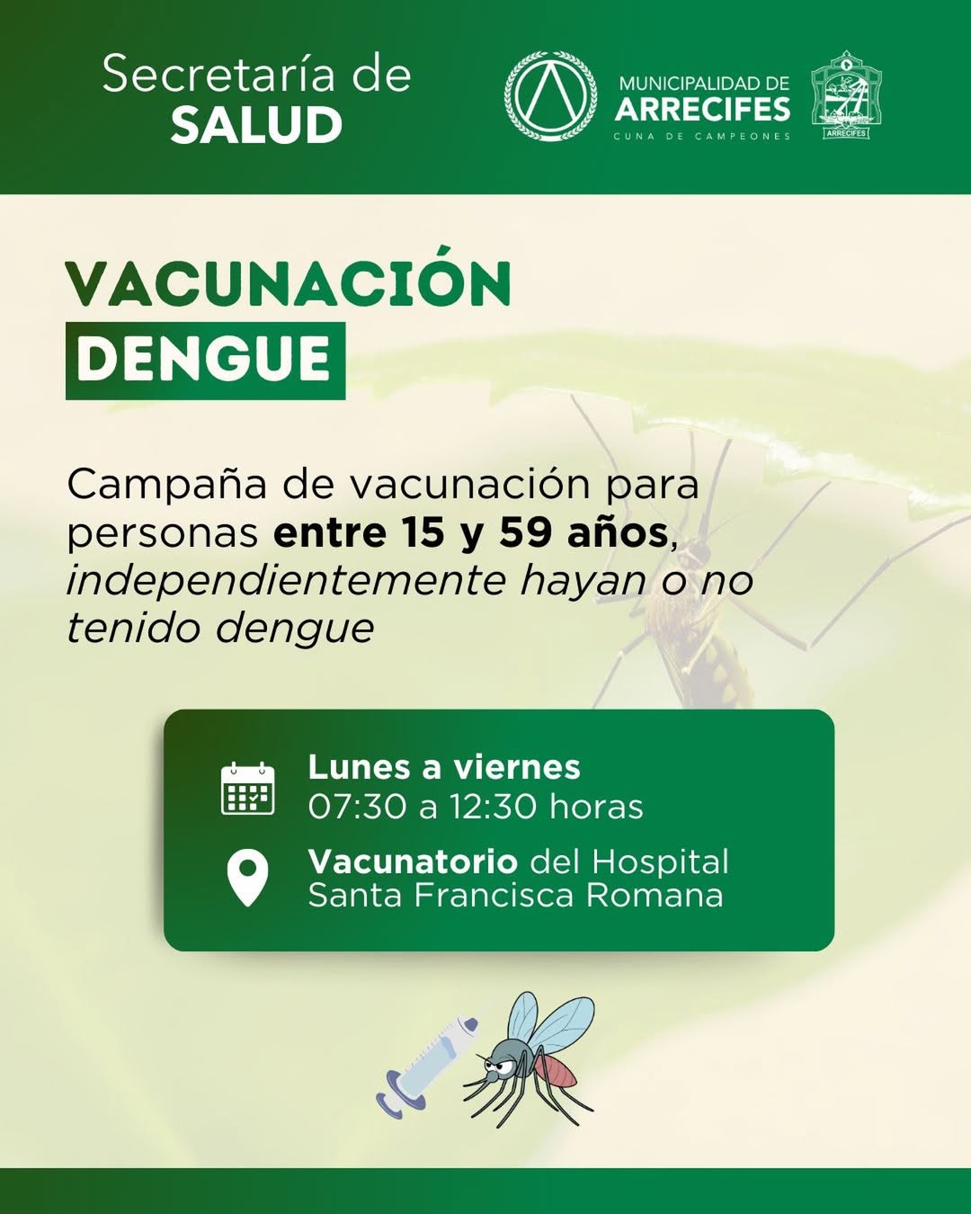La Secretaría de Salud informa que ya está en marcha la Campaña de Vacunación contra el Dengue, destinada a personas de 15 a 59 años, hayan tenido o no dengue.