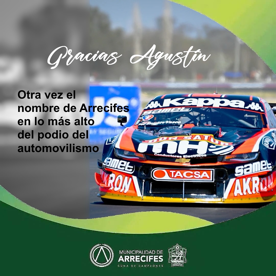 La Municipalidad de Arrecifes felicita a Agustín Canapino, quien se impuso con su Chevrolet Camaro en el Autódromo Rosendo Hernández en San Luis, en el TC. Con este triunfo, Canapino lidera la Copa de Oro RUS 2025.