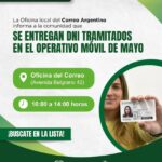 La Oficina local del Correo Argentino informa a la comunidad que ya se encuentran disponibles para su retiro los Documentos Nacionales de Identidad (DNI) tramitados durante el operativo móvil de documentación realizado en el mes de mayo. A continuación, se detalla el listado de personas que deben acercarse a la oficina del Correo (Avenida Belgrano…