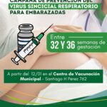 La Secretaría de Salud de la Municipalidad informa que continúa la campaña de prevención del Virus Sincicial Respiratorio (VSR) dirigida a embarazadas que se encuentren entre las semanas 32 y 36 de gestación. Acercate al Centro de Vacunación Municipal (Santiago H. Pérez 762).