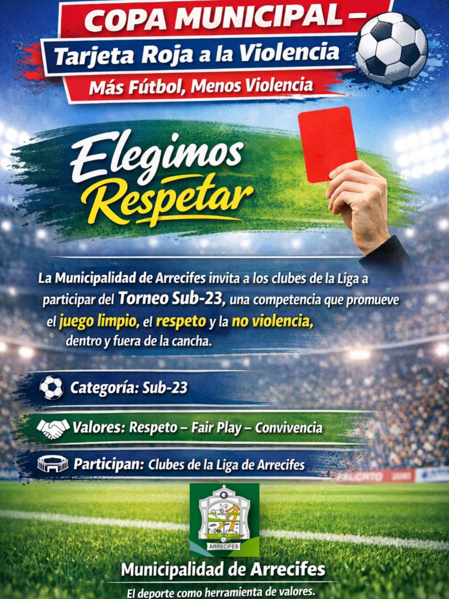 La Municipalidad de Arrecifes invita a todos los clubes que integran la Liga de Arrecifes a participar de la Copa Municipal “Más Fútbol, Menos Violencia”, un torneo Sub-23 que busca fortalecer los valores del deporte como herramienta de formación social.