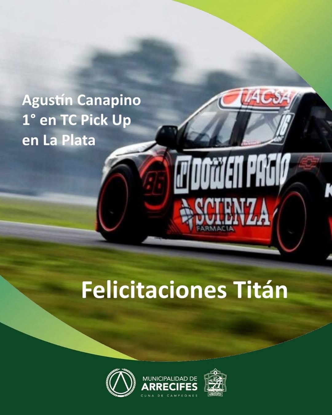 La Municipalidad de Arrecifes felicita una vez más a Agustín Canapino por otro brillante triunfo en el Turismo Carretera, esta vez en Paraná (Entre Ríos). Con cuatro victorias consecutivas, el piloto arrecifeño continúa firme en la cima de la Copa de Oro.