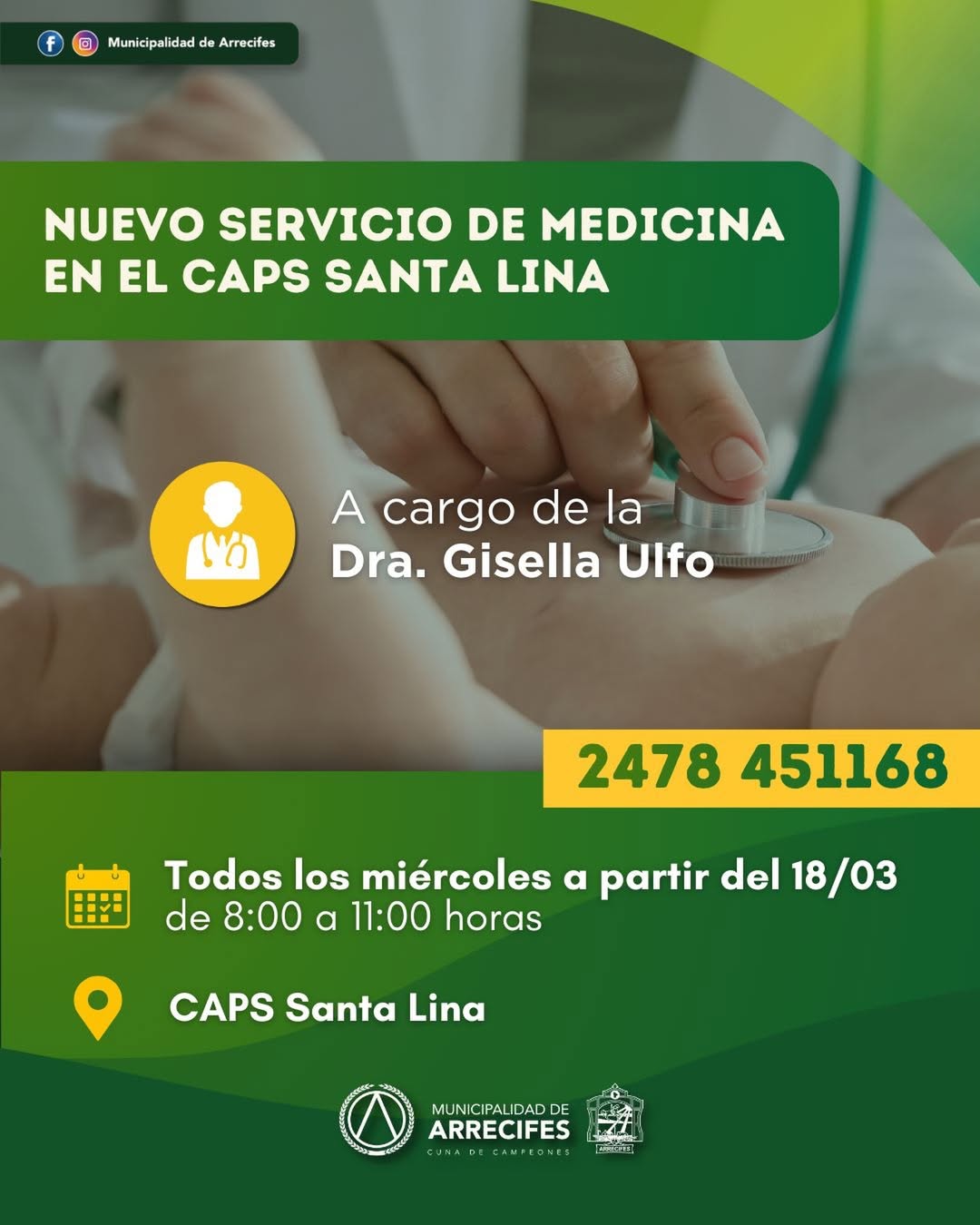 A partir del miércoles 18 de marzo, y todos los miércoles de 08:00 a 11:00 horas, atenderá en el CAPS de Santa Lina la Dra. Gisella Ulfo, con el servicio de médica clínica.