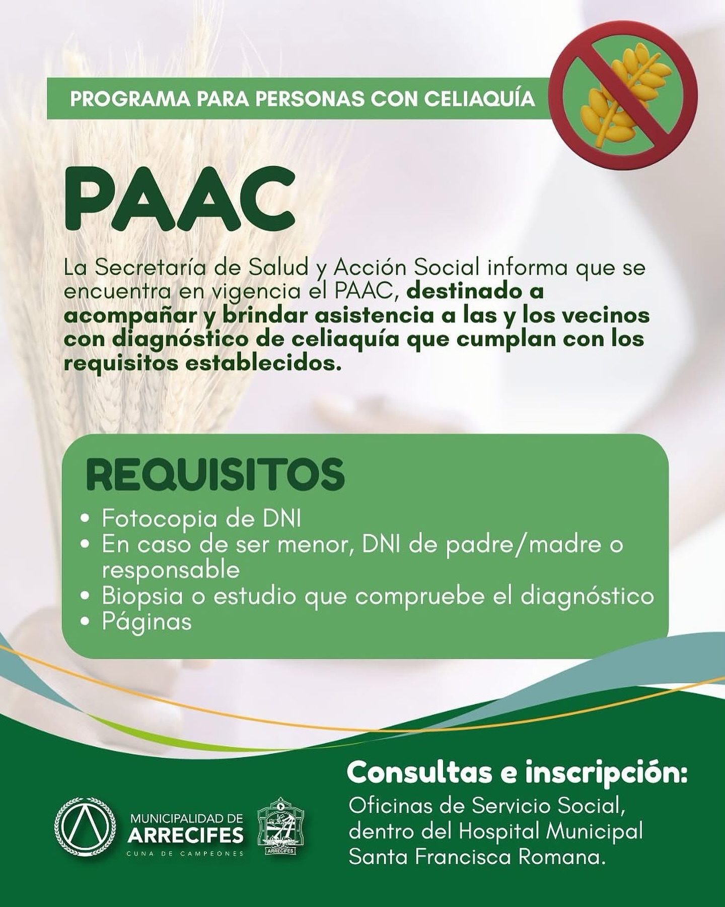 La Secretaría de Salud y Acción Social informa que ya está en vigencia el PAAC, un programa destinado a brindar acompañamiento y asistencia a vecinas y vecinos con celiaquía que cumplan con los requisitos establecidos.