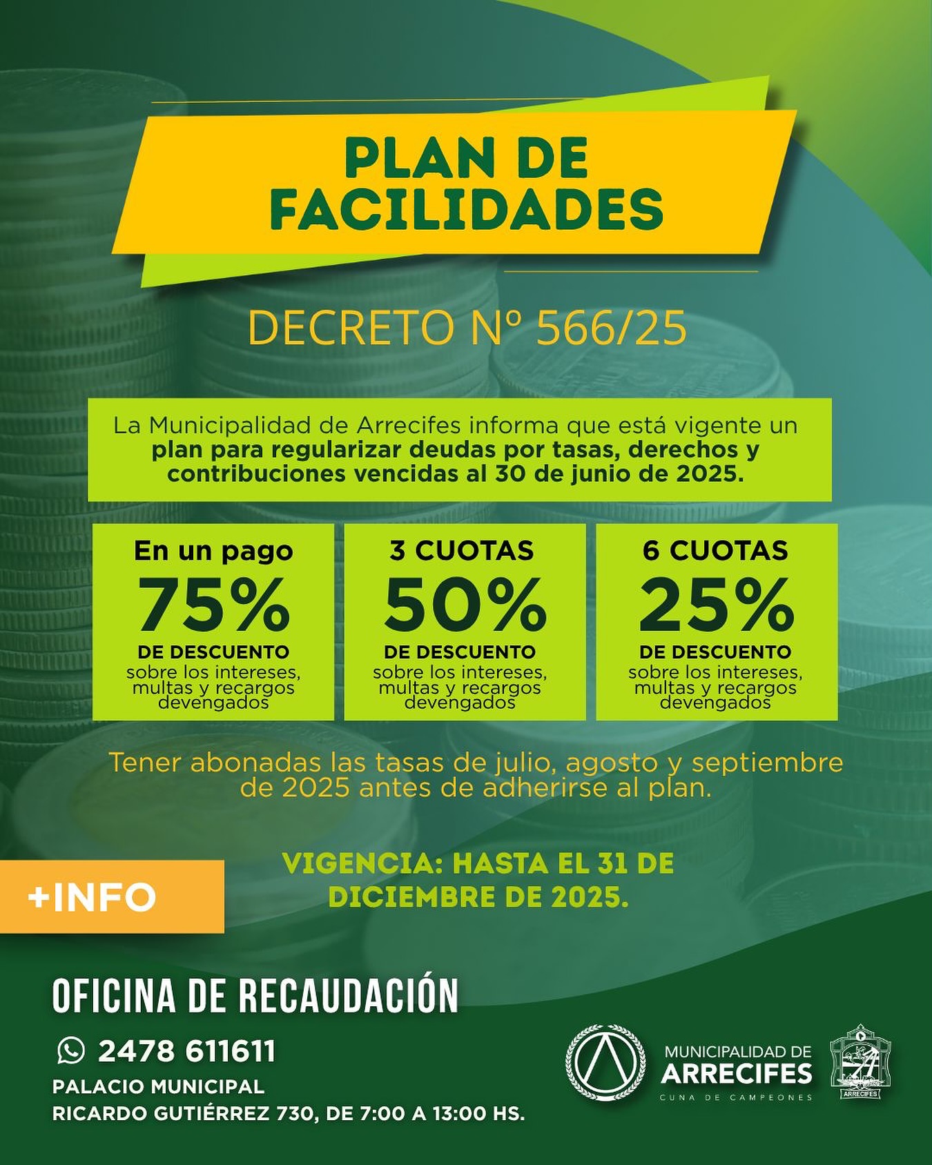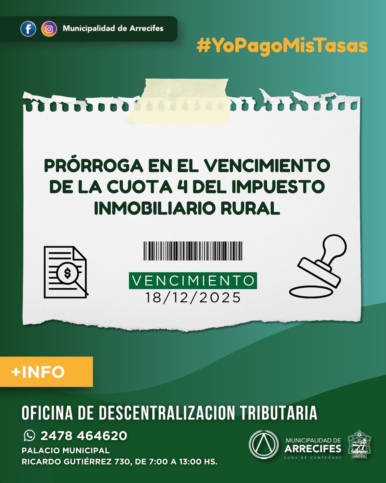 La Oficina de Descentralización Tributaria informa que el vencimiento de la cuota 4 del Impuesto Inmobiliario Rural ha sido prorrogado hasta el 18 de diciembre. ¡No olvides realizar tu pago a tiempo!